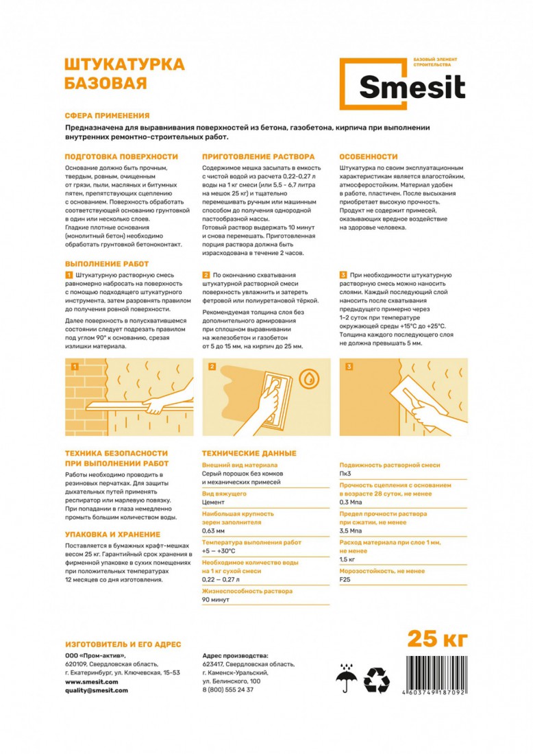 Штукатурка цементная Smesit базовая 25 кг, 48 шт/поддон купить в Сургуте по оптовой цене в интернет магазине СтройПлатформа. Штукатурка базовая Smesit – это цементная выравнивающая смесь, предназначенная для ручного нанесения на стены из бетона, газобетона и кирпича. Продукт подходит для внутренних и наружных ремонтно-строительных работ, обеспечивая ровное и прочное покрытие.