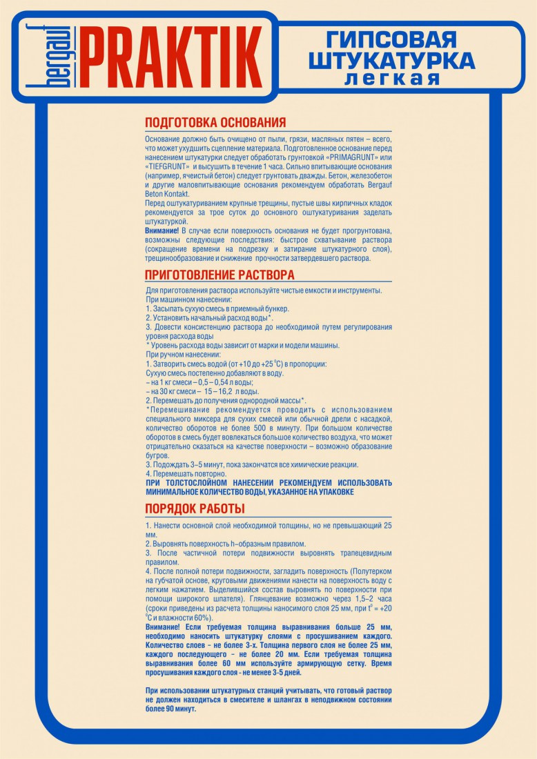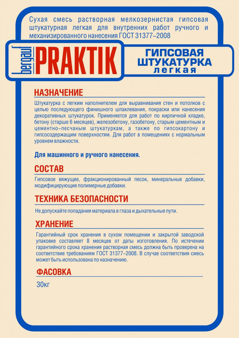 Штукатурка гипсовая Bergauf Praktik легкая 30 кг, шт купить в Сургуте по оптовой цене в интернет магазине СтройПлатформа. Штукатурка гипсовая легкая Бергауф Практик с легким наполнителем для выравнивания стен и потолков с целью последующего наклеивания обоев или финишного шпаклевания.