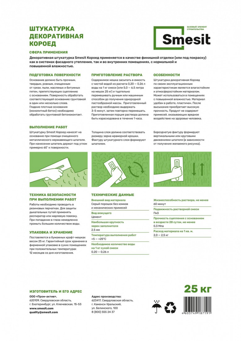Штукатурка декоративная Smesit Короед, зерно 2,5 мм, 25 кг, 48 шт/ поддон купить в Сургуте по оптовой цене в интернет магазине СтройПлатформа. Декоративная штукатурка "Короед" от Smesit предназначена для создания рельефных покрытий с характерным узором. Этот материал подходит для отделки стен и потолков внутри помещений, придавая поверхностям оригинальный и индивидуальный вид.