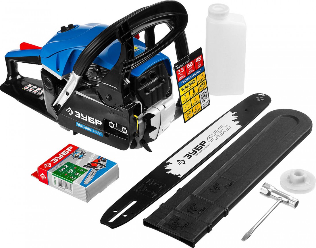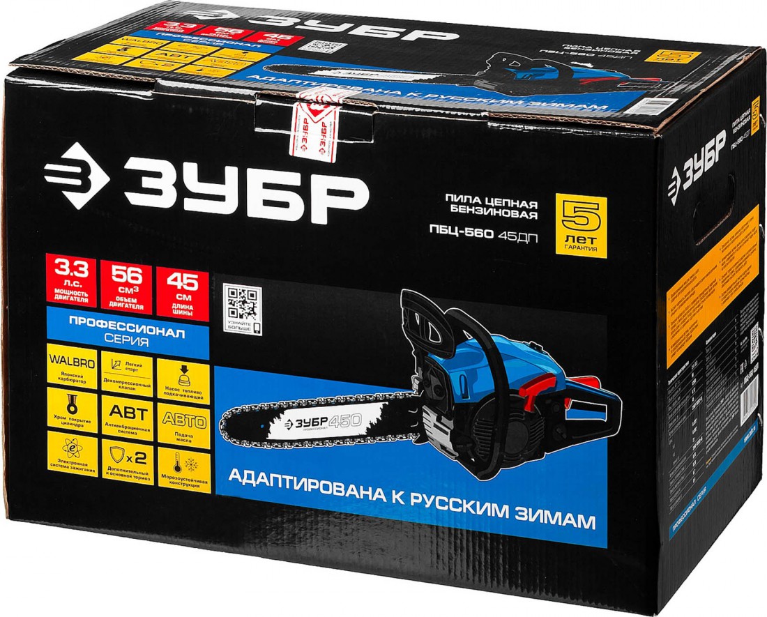 Безнопила Зубр Профессионал 2,4 кВт/3,3 л.с, 450 мм, ПБЦ-560 45ДП купить в Сургуте по оптовой цене в интернет магазине СтройПлатформа. Бензиновая пила ЗУБР – это мощный и надежный инструмент для работы с деревом на дачном участке, в саду или в лесу. Она идеально подходит для распила досок, бруса, стволов деревьев различных пород. В отличие от электрических моделей, бензиновая пила оснащена более мощным двигателем, что позволяет использовать ее в любых условиях – независимо от погоды и наличия электросети. Благодаря отсутствию электрического привода, пила безопасна в использовании и не требует подключения к сети.