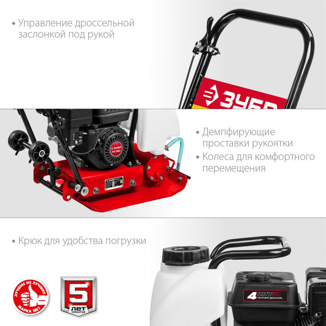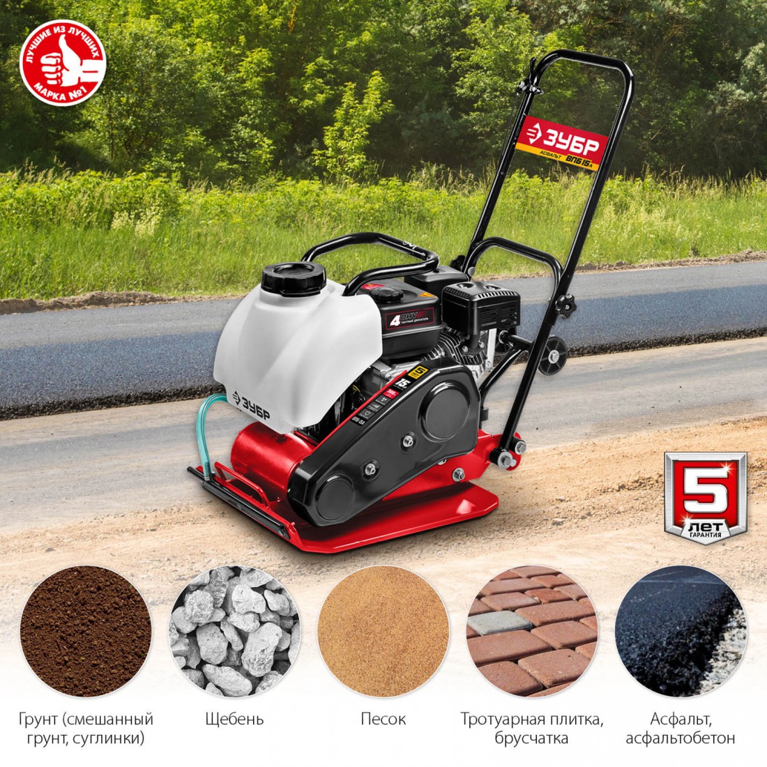 Виброплита предназначена для уплотнения бетонных, асфальтовых и сыпучих материалов, а также для формирования уплотненных поверхностей. Компактная конструкция позволяет осуществлять уплотнение смешанного грунта в самых узких местах, даже в очень узких траншеях. Направляющая рукоятка с виброзащитой позволяет увеличить количество часов непрерывной работы и снизить усталость для оператора. Четырехтактный двигатель ″ЗУБР″ обеспечит беспроблемную эксплуатацию при минимальном сервисном обслуживании на весь срок использования.