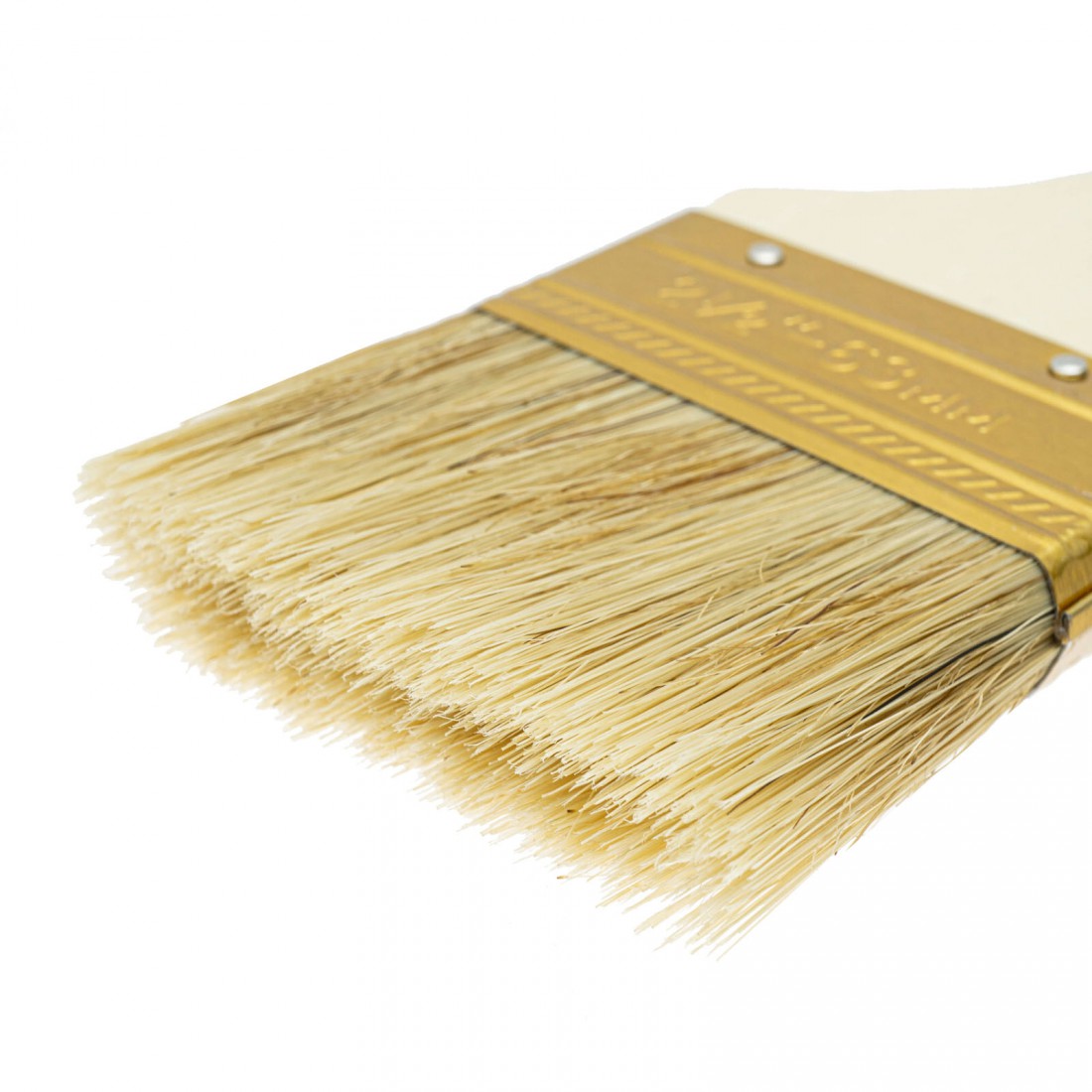 Кисти с натуральной щетиной идеально подходят для покраски деревянных поверхностей, нанесения густых и вязких материалов, а также работы с эмалями по металлу, обеспечивая гладкое покрытие без разводов. Бандаж из лакированной жести защищает кисть от коррозии, а щетина надежно зафиксирована с помощью эпоксидного клея и деревянных клиньев. Деревянная рукоятка покрыта лаком для дополнительной защиты и удобства, а ярко окрашенный кончик кисти облегчает её идентификацию среди других инструментов.