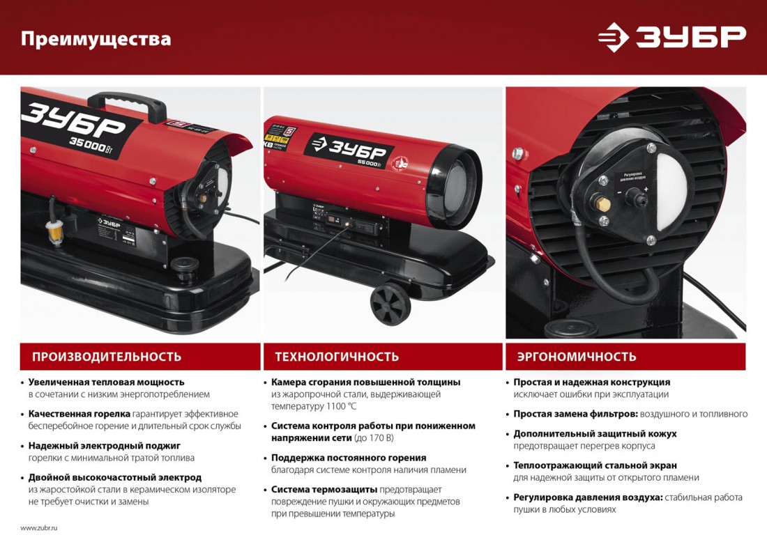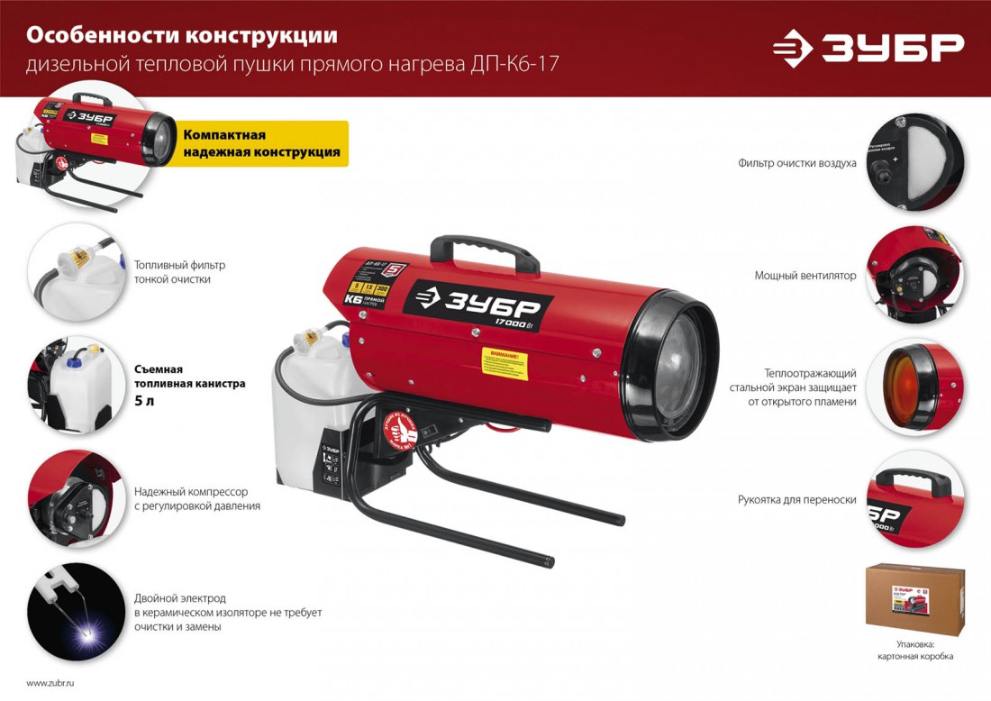 Тепловая пушка дизельная, прямой нагрев, Зубр 17 кВт ДП-К6-17 купить в Сургуте по оптовой цене в интернет магазине СтройПлатформа. Дизельная тепловая пушка прямого нагрева ЗУБР ДП-К6-17 предназначена для быстрого обогрева и сушки помещений с хорошей вентиляцией — складов, строительных площадок, ангаров, цехов и т.п. Модель отличается высоким КПД, надежным поджигом и стабильной работой при любых погодных условиях.