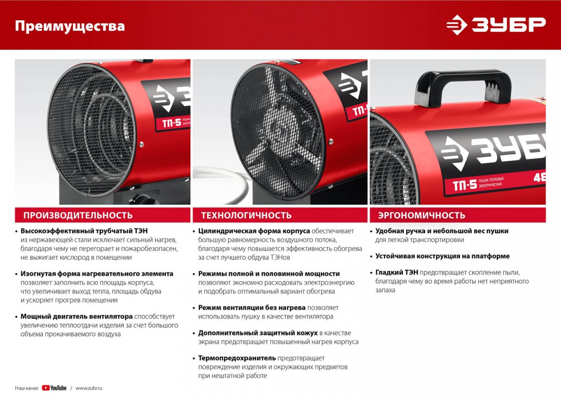 Тепловая пушка электрическая Зубр 5 кВт ТП-5 купить в Сургуте по оптовой цене в интернет магазине СтройПлатформа. Электрическая тепловая пушка ЗУБР ТП-5 предназначена для обогрева, просушки и поддержания комфортной температуры в помещениях различного назначения — жилых, бытовых и производственных. Компактный корпус и малая масса делают прибор удобным для перемещения и эксплуатации в гараже, мастерской, на складе или даче.