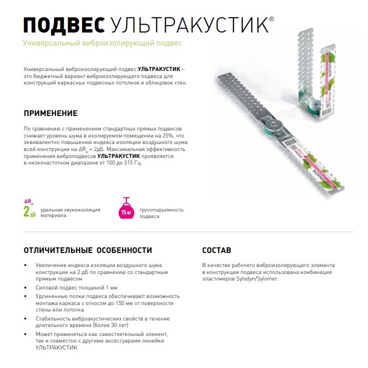 Основная особенность — увеличение индекса изоляции воздушного шума на 2 дБ (ΔRw), что соответствует снижению звукового давления на 25% по сравнению со стандартными прямыми подвесами. Эффективен в диапазоне частот от 100 до 315 Гц.