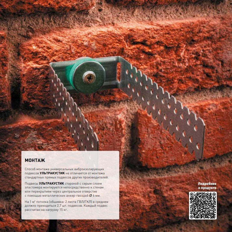 Монтаж не требует специальных навыков — выполняется так же, как и установка обычных прямых подвесов. Эластомерный слой должен прилегать к несущей поверхности серой стороной.