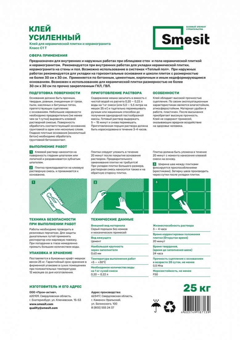 Клей Smesit Усиленный C1 для керамической плитки 25 кг, шт купить в Сургуте по оптовой цене в интернет магазине СтройПлатформа. Клей для плитки Smesit Усиленный предназначен для надежной укладки керамической и керамогранитной плитки при внутренних и наружных работах. Продукт обеспечивает прочное сцепление с различными недеформирующимися основаниями, включая бетон, цемент, кирпич, а также подходит для укладки плитки на прочно закрепленные ГКЛ и ГВЛ.