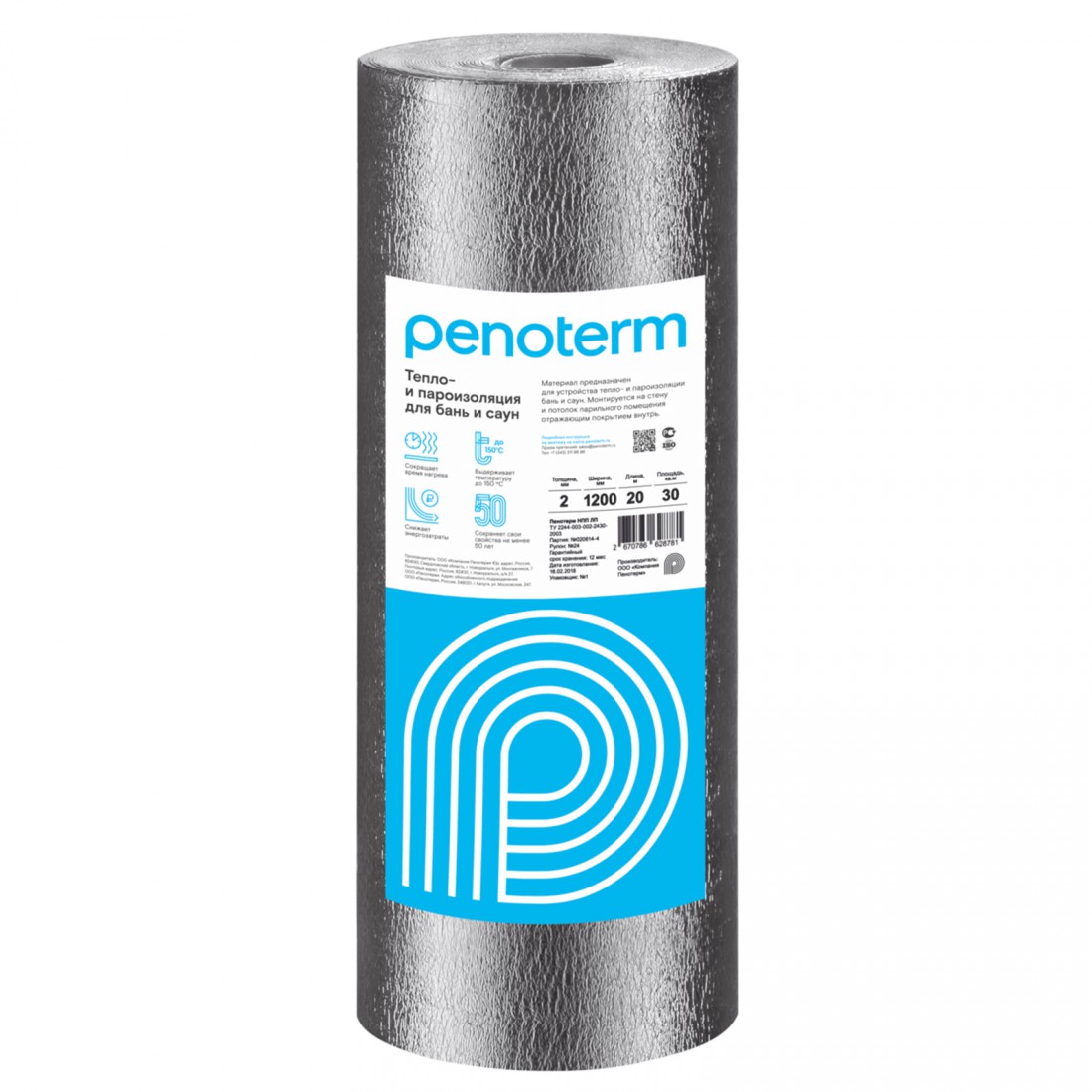 Отражающая изоляция Пенотерм НПП ЛФ для бань и саун 2 мм 1,2х25 м, 30 м2/рул купить в Сургуте по оптовой цене в интернет магазине СтройПлатформа. Рулонный тепло- и пароизоляционный материал, ламинированный алюминиевой фольгой, изготовлен экструзионным методом из вспененного полипропилена.