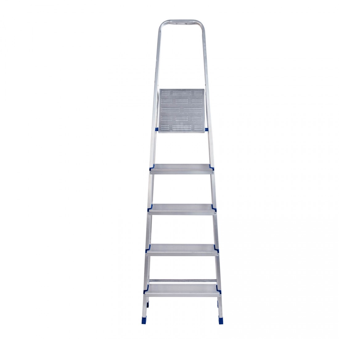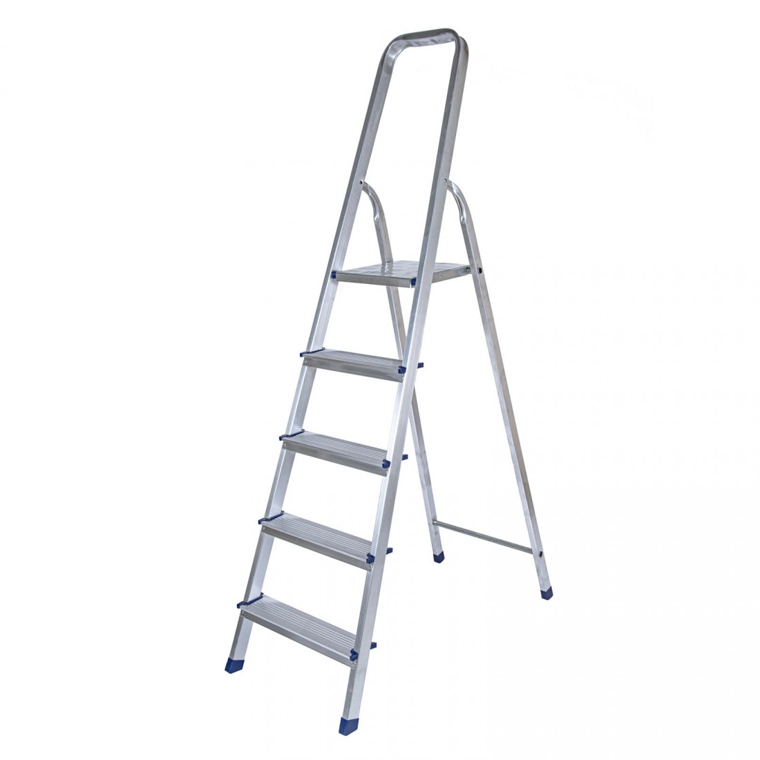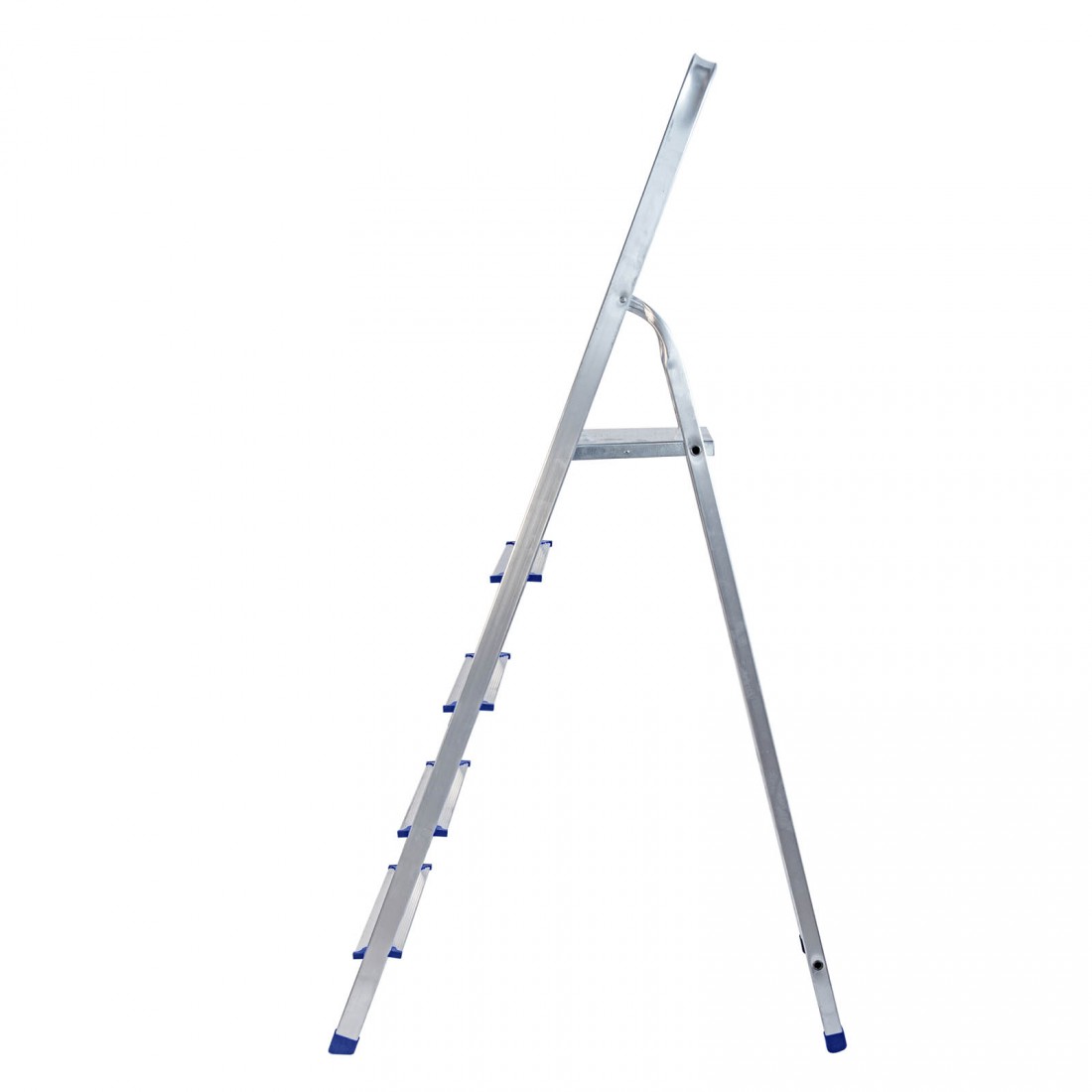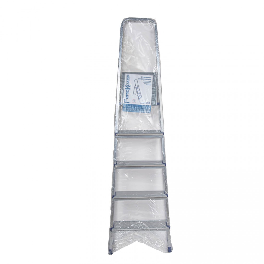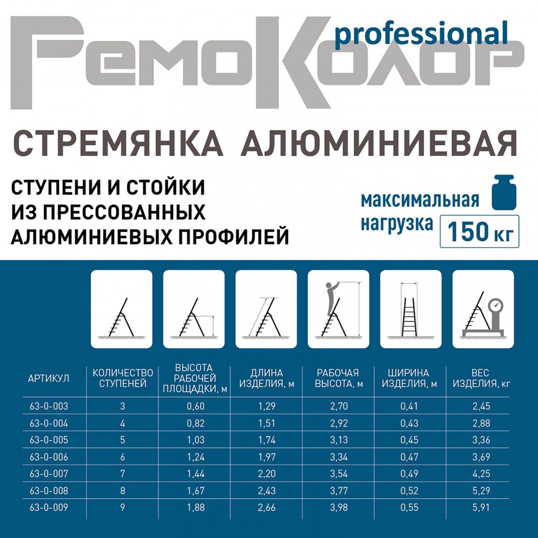Стремянка алюминиевая, 5 ступеней, шт купить в Сургуте по оптовой цене в интернет магазине СтройПлатформа. Стремянка алюминиевая односторонняя РемоКолор Professional, 5 ступеней - Профессиональная пятиступенчатая стремянка обеспечивает комфортный доступ на высоту до 3,13 метра, оставаясь при этом исключительно легкой (3,7 кг) и компактной в хранении. Уникальное сочетание рабочей высоты и узкой конструкции глубиной всего 11 см делает ее идеальным решением для работ в ограниченном пространстве. Усиленная алюминиевая конструкция сохраняет грузоподъемность 150 кг, что позволяет безопасно работать с инструментом и материалами.