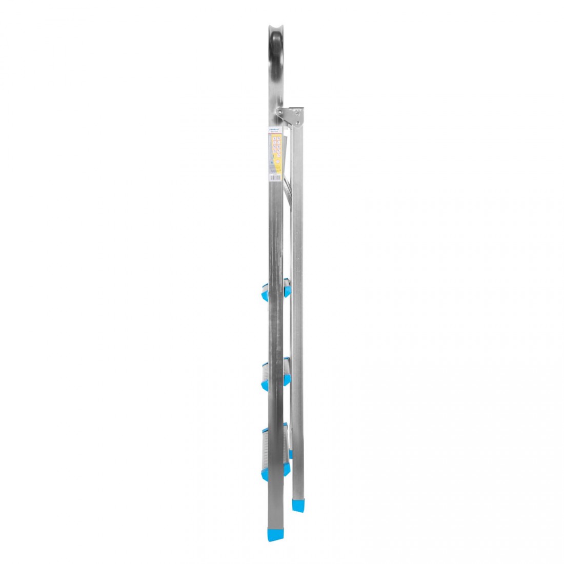Компактные габариты в сложенном виде (0.1м x 0.44м x 1.32м) позволяют хранить стремянку в ограниченном пространстве. Увеличенная высота площадки 0,77 м обеспечивает удобство при выполнении продолжительных работ. Односторонняя конструкция оптимизирована для использования в узких проходах и помещениях с ограниченной площадью.