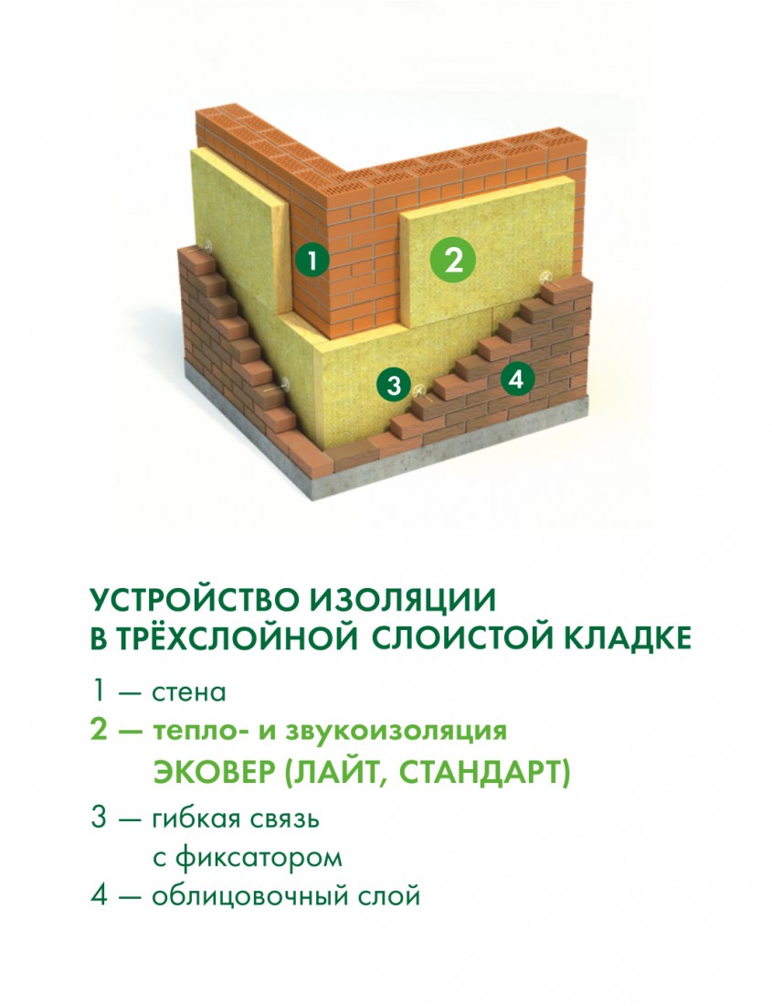 - В качестве нижнего (внутреннего) слоя при двухслойном утеплении в сочетании с плитой марки Эковер Вент-Фасад в конструкциях вентилируемых фасадов;